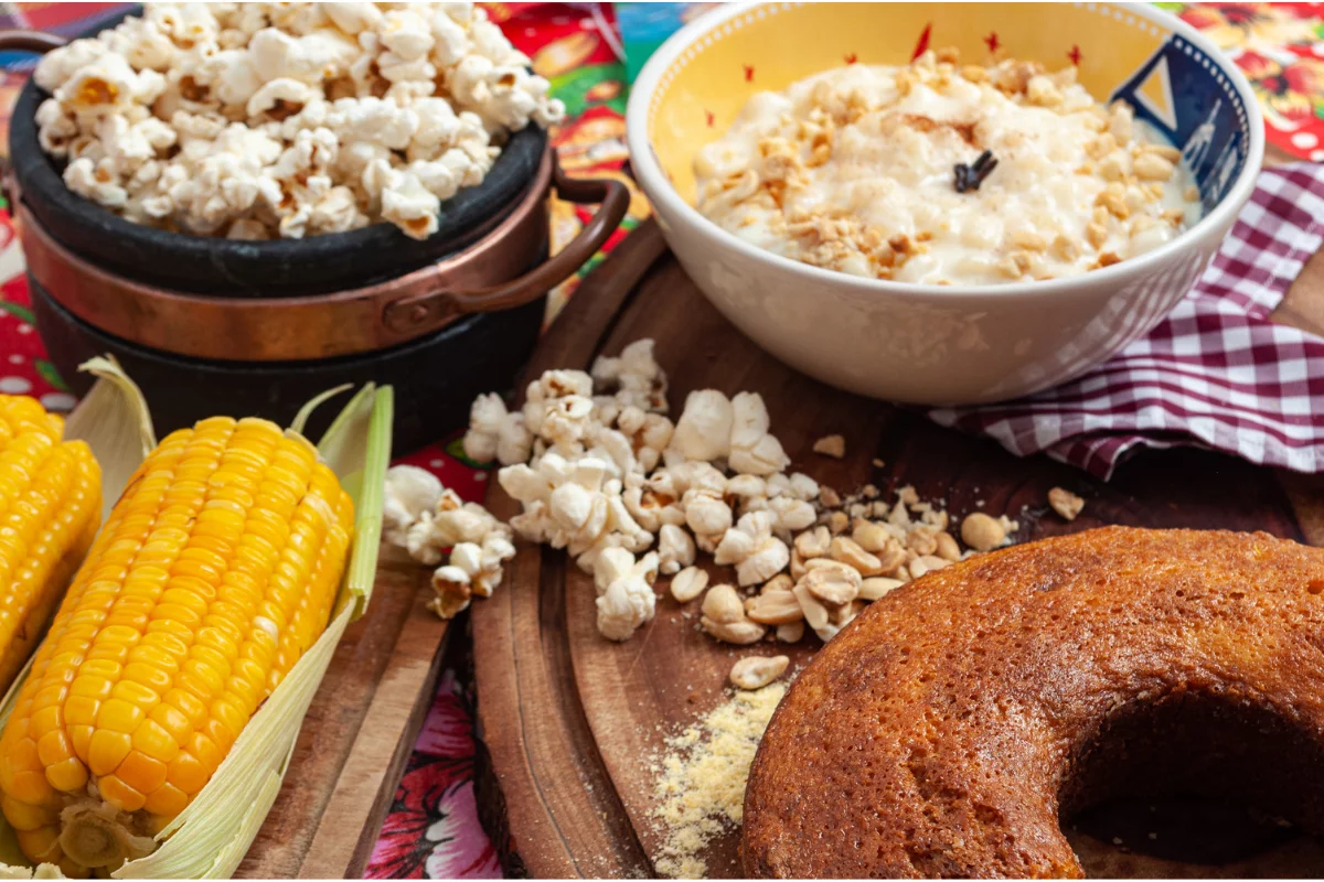 Ao pensar em pratos típicos, já é possível visualizar as gostosuras feitas a partir do milho, bem como o bolo de milho, pamonha, pipoca e o próprio milho cozido. Outra estrela da festa é o amendoim. Neste sentido, você vai encontrar o pé de moleque, paçoca e amendoim torrado.